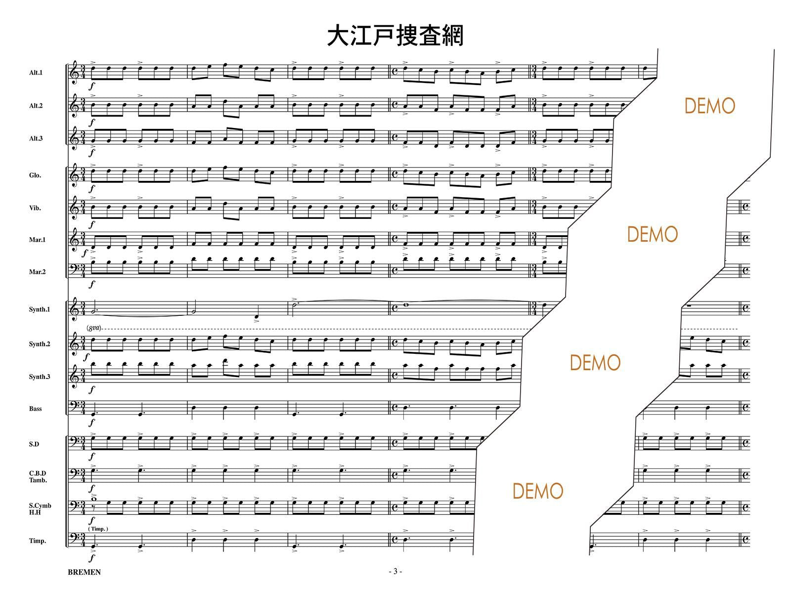 主な使用楽器:鍵盤ハーモニカ、グロッケン(鉄琴)、ビブラフォーン(鉄琴)、マリンバ(木琴)、シンセサイザー(電子オルガン)、ベース(低音楽器)、スネアドラム(小太鼓)、バスドラム(大太鼓)、パーカッション、ティンパニー等