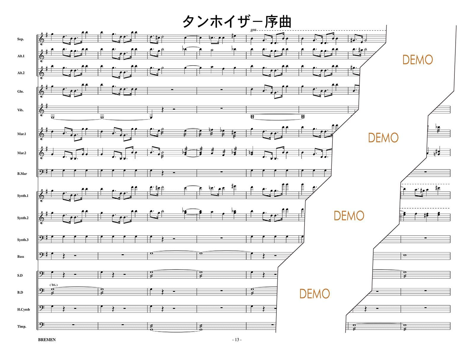 主な使用楽器:鍵盤ハーモニカ、グロッケン(鉄琴)、ビブラフォーン(鉄琴)、マリンバ(木琴)、シンセサイザー(電子オルガン)、ベース(低音楽器)、スネアドラム(小太鼓)、バスドラム(大太鼓)、パーカッション、ティンパニー等