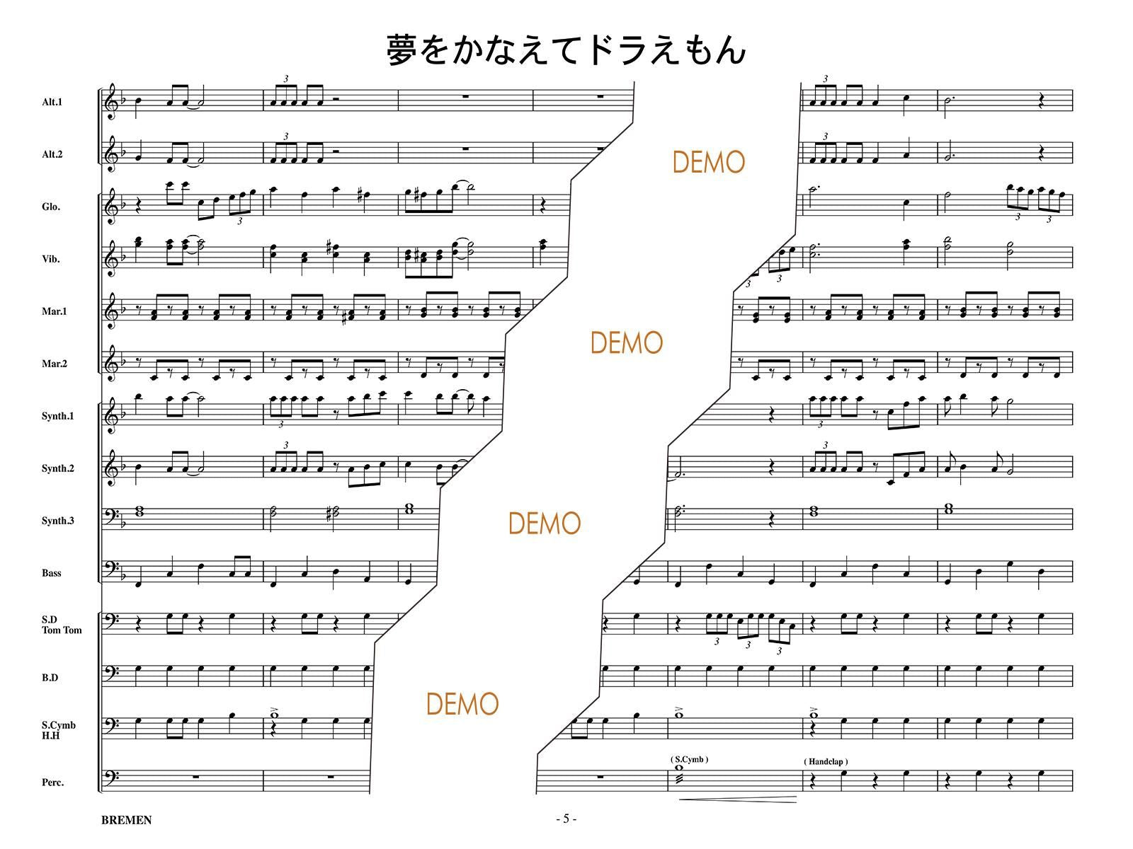 主な使用楽器:鍵盤ハーモニカ、グロッケン(鉄琴)、ビブラフォーン(鉄琴)、マリンバ(木琴)、シンセサイザー(電子オルガン)、ベース(低音楽器)、スネアドラム(小太鼓)、バスドラム(大太鼓)、パーカッション、ティンパニー等
