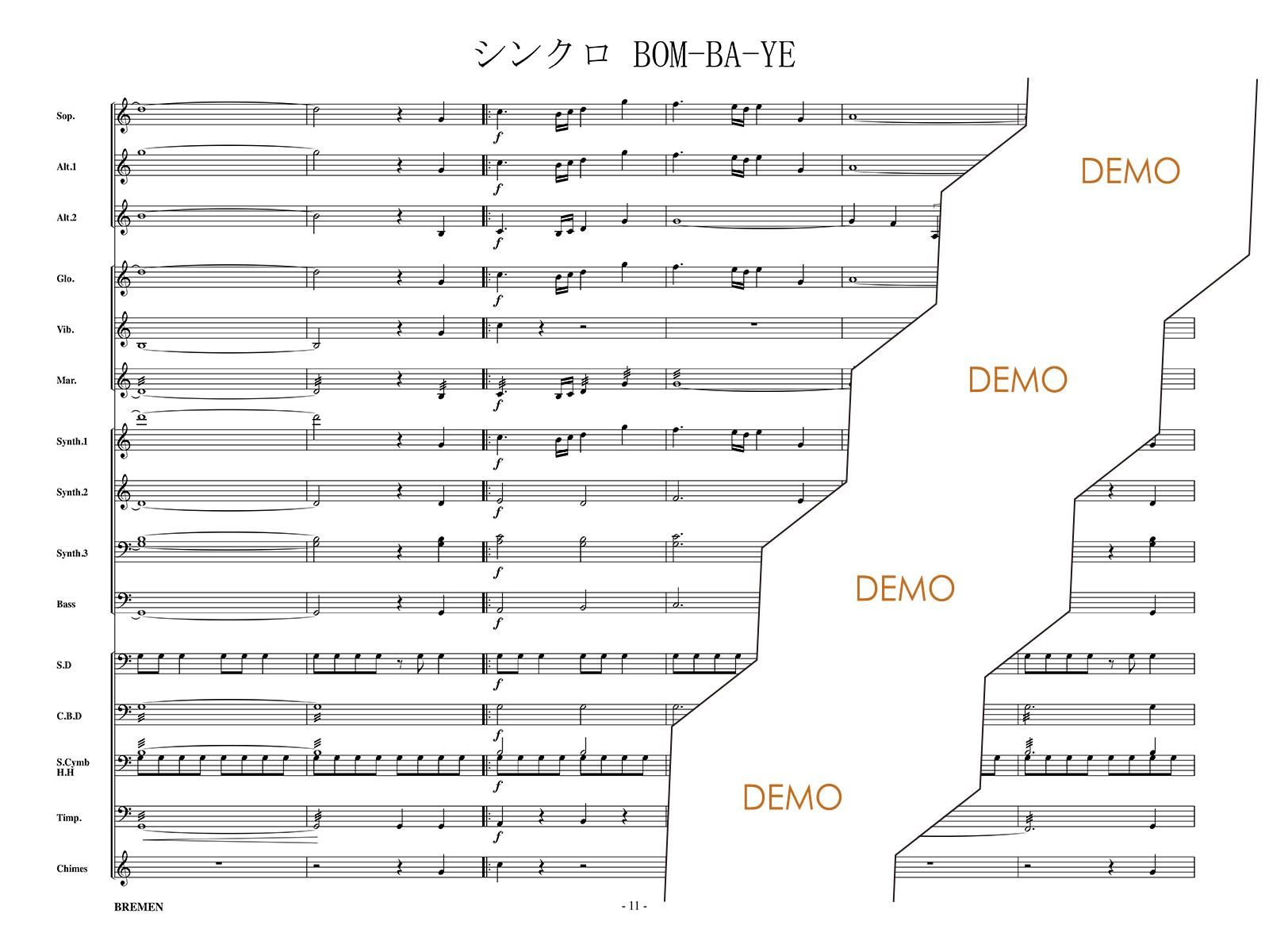 主な使用楽器:鍵盤ハーモニカ、グロッケン(鉄琴)、ビブラフォーン(鉄琴)、マリンバ(木琴)、シンセサイザー(電子オルガン)、ベース(低音楽器)、スネアドラム(小太鼓)、バスドラム(大太鼓)、パーカッション、ティンパニー等