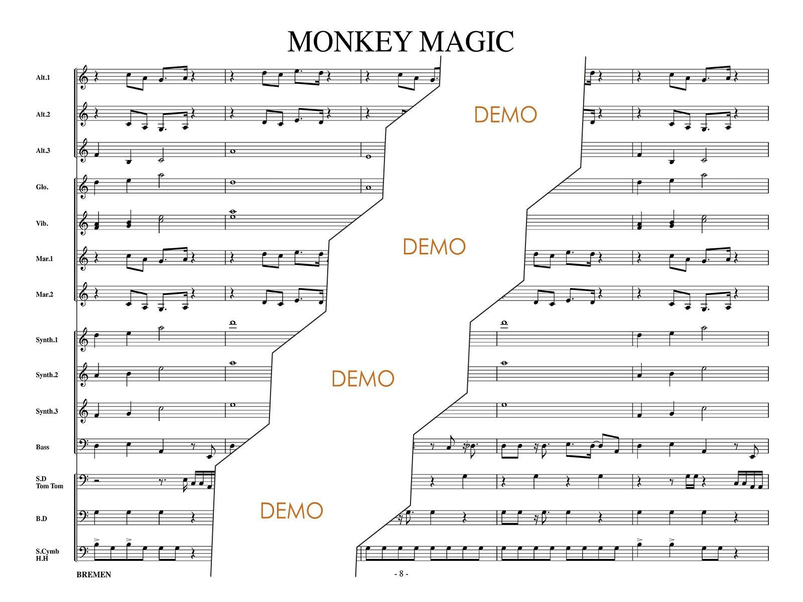 主な使用楽器:鍵盤ハーモニカ、グロッケン(鉄琴)、ビブラフォーン(鉄琴)、マリンバ(木琴)、シンセサイザー(電子オルガン)、ベース(低音楽器)、スネアドラム(小太鼓)、バスドラム(大太鼓)、パーカッション、ティンパニー等