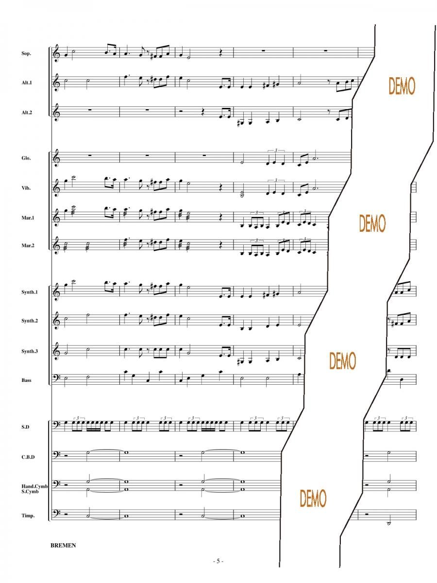 主な使用楽器:鍵盤ハーモニカ、グロッケン(鉄琴)、ビブラフォーン(鉄琴)、マリンバ(木琴)、シンセサイザー(電子オルガン)、ベース(低音楽器)、スネアドラム(小太鼓)、バスドラム(大太鼓)、パーカッション、ティンパニー等
