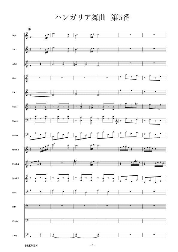 主な使用楽器:鍵盤ハーモニカ、グロッケン(鉄琴)、ビブラフォーン(鉄琴)、マリンバ(木琴)、シンセサイザー(電子オルガン)、ベース(低音楽器)、スネアドラム(小太鼓)、バスドラム(大太鼓)、パーカッション、ティンパニー等