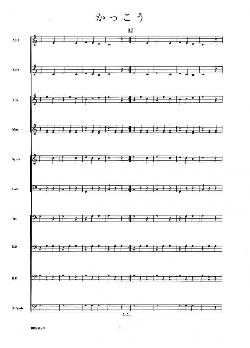 主な使用楽器:鍵盤ハーモニカ、グロッケン(鉄琴)、ビブラフォーン(鉄琴)、マリンバ(木琴)、シンセサイザー(電子オルガン)、ベース(低音楽器)、スネアドラム(小太鼓)、バスドラム(大太鼓)、パーカッション、ティンパニー等