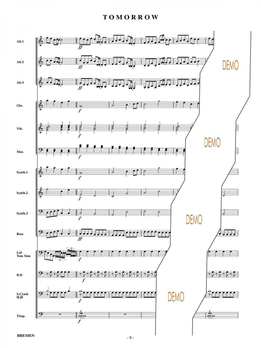 主な使用楽器:鍵盤ハーモニカ、グロッケン(鉄琴)、ビブラフォーン(鉄琴)、マリンバ(木琴)、シンセサイザー(電子オルガン)、ベース(低音楽器)、スネアドラム(小太鼓)、バスドラム(大太鼓)、パーカッション、ティンパニー等