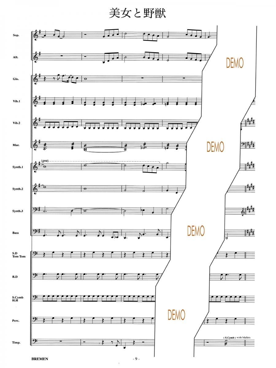 主な使用楽器:鍵盤ハーモニカ、グロッケン(鉄琴)、ビブラフォーン(鉄琴)、マリンバ(木琴)、シンセサイザー(電子オルガン)、ベース(低音楽器)、スネアドラム(小太鼓)、バスドラム(大太鼓)、パーカッション、ティンパニー等