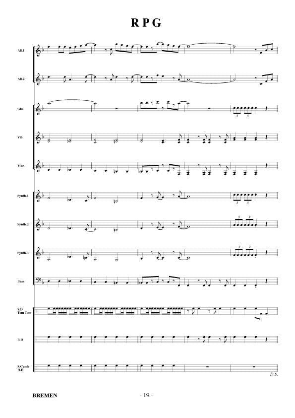 主な使用楽器:鍵盤ハーモニカ、グロッケン(鉄琴)、ビブラフォーン(鉄琴)、マリンバ(木琴)、シンセサイザー(電子オルガン)、ベース(低音楽器)、スネアドラム(小太鼓)、バスドラム(大太鼓)、パーカッション、ティンパニー等