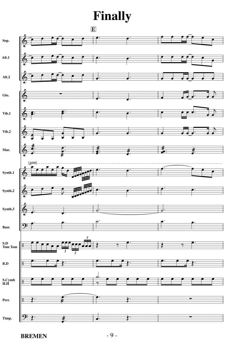主な使用楽器:鍵盤ハーモニカ、グロッケン(鉄琴)、ビブラフォーン(鉄琴)、マリンバ(木琴)、シンセサイザー(電子オルガン)、ベース(低音楽器)、スネアドラム(小太鼓)、バスドラム(大太鼓)、パーカッション、ティンパニー等