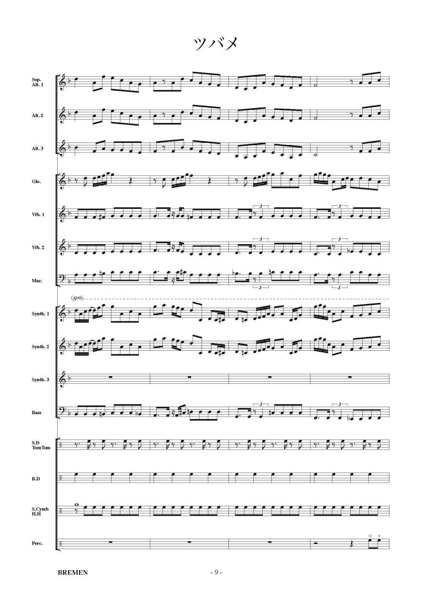 主な使用楽器:鍵盤ハーモニカ、グロッケン(鉄琴)、ビブラフォーン(鉄琴)、マリンバ(木琴)、シンセサイザー(電子オルガン)、ベース(低音楽器)、スネアドラム(小太鼓)、バスドラム(大太鼓)、パーカッション、ティンパニー等