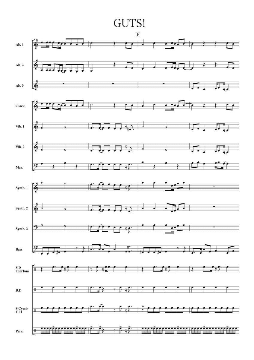 主な使用楽器:鍵盤ハーモニカ、グロッケン(鉄琴)、ビブラフォーン(鉄琴)、マリンバ(木琴)、シンセサイザー(電子オルガン)、ベース(低音楽器)、スネアドラム(小太鼓)、バスドラム(大太鼓)、パーカッション、ティンパニー等