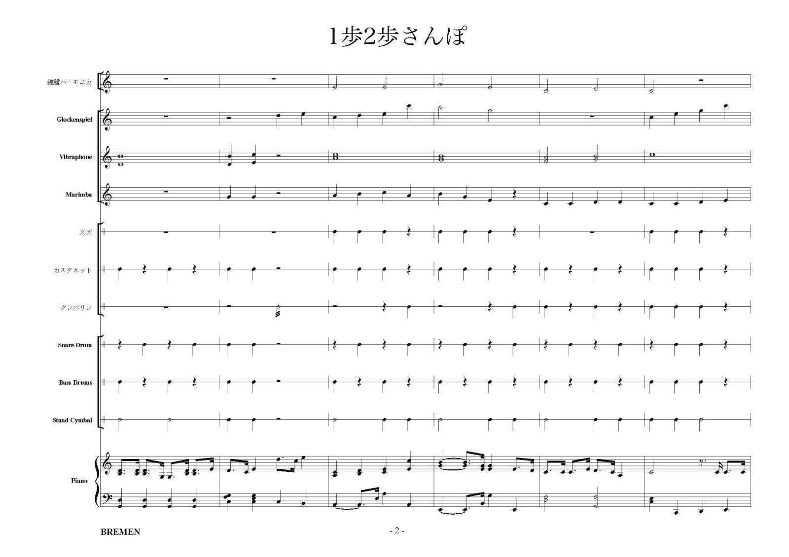 主な使用楽器:鍵盤ハーモニカ、グロッケン、ビブラフォン、マリンバ、スズ、カスタネット、タンバリン、スネアドラム(小太鼓)、バスドラム(大太鼓)、スタンドシンバル、ピアノ