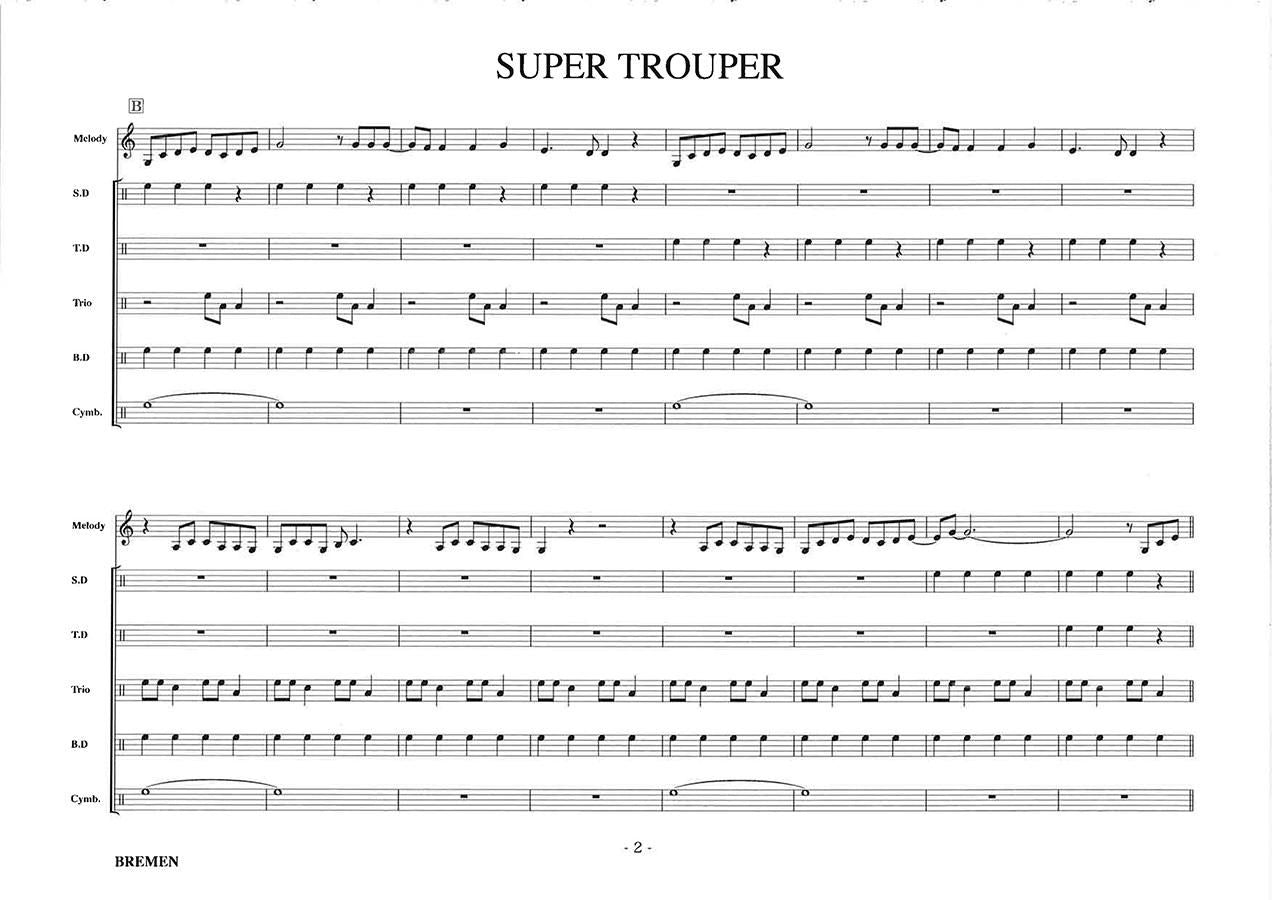 主な使用楽器:スネアドラム(小太鼓)、テナードラム(中太鼓)、トリオタム(ツインタム)、バスドラム(大太鼓)、シンバル等