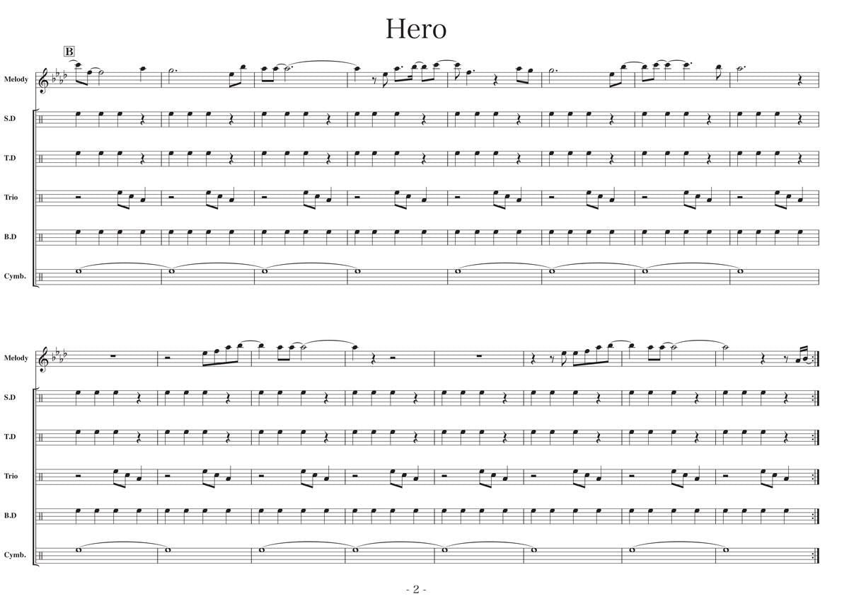 主な使用楽器:スネアドラム(小太鼓)、テナードラム(中太鼓)、トリオタム(ツインタム)、バスドラム(大太鼓)、シンバル等
