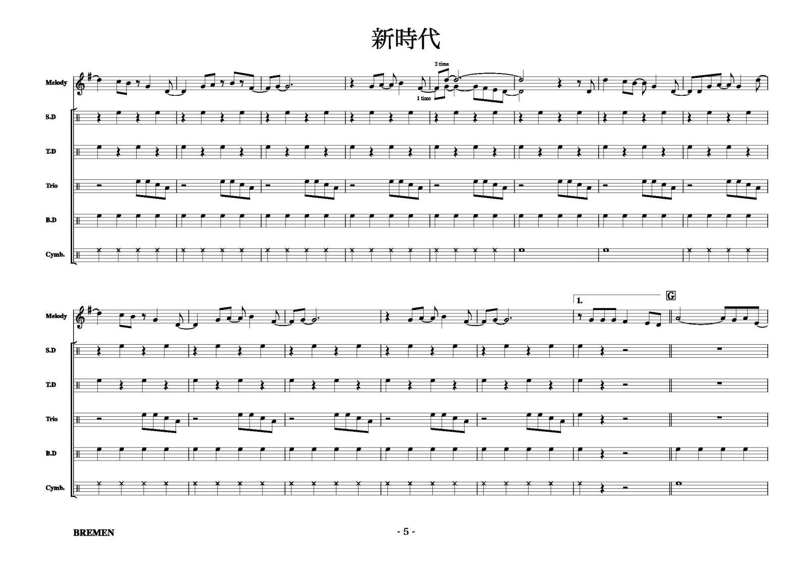 主な使用楽器:スネアドラム(小太鼓)、テナードラム(中太鼓)、トリオタム(ツインタム)、バスドラム(大太鼓)、シンバル等