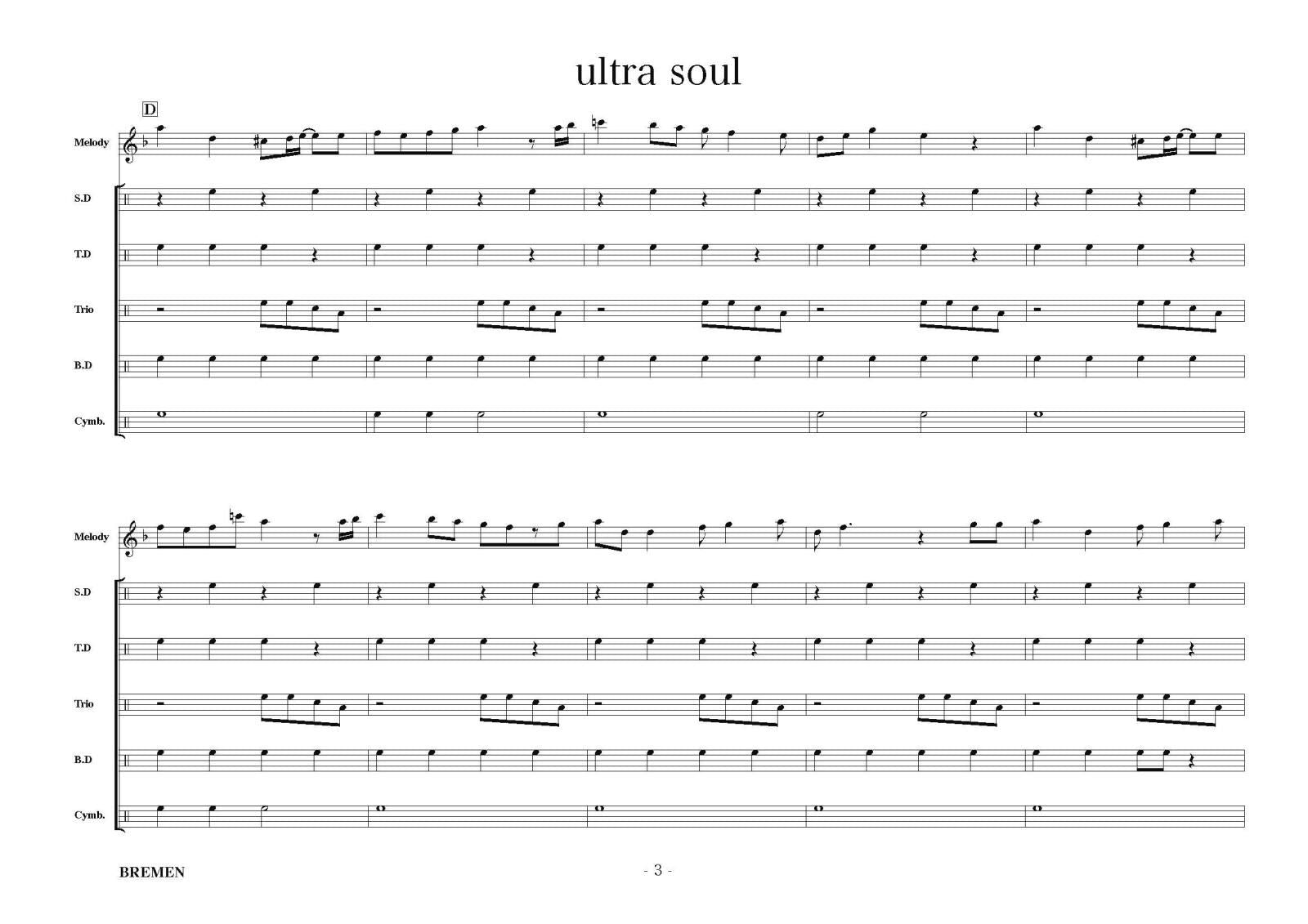 主な使用楽器:スネアドラム(小太鼓)、テナードラム(中太鼓)、トリオタム(ツインタム)、バスドラム(大太鼓)、シンバル等