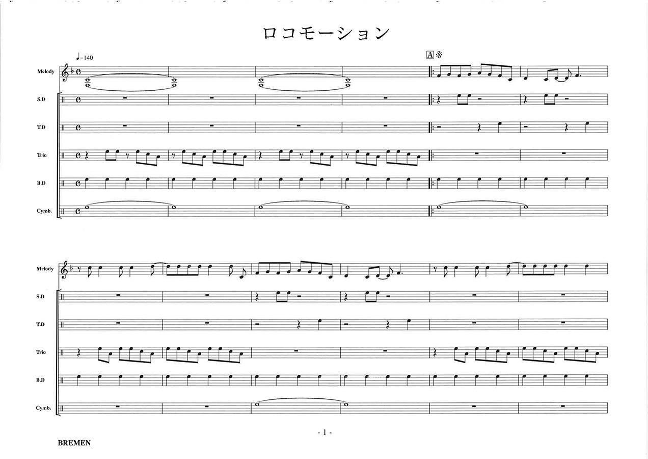 主な使用楽器:スネアドラム(小太鼓)、テナードラム(中太鼓)、トリオタム(ツインタム)、バスドラム(大太鼓)、シンバル等