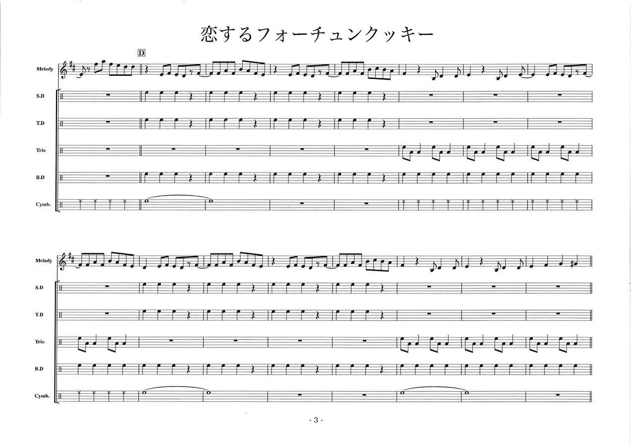 主な使用楽器:スネアドラム(小太鼓)、テナードラム(中太鼓)、トリオタム(ツインタム)、バスドラム(大太鼓)、シンバル等