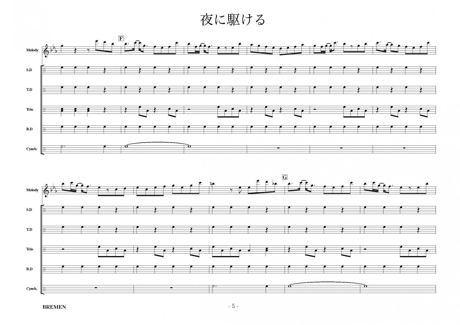 主な使用楽器:スネアドラム(小太鼓)、テナードラム(中太鼓)、トリオタム(ツインタム)、バスドラム(大太鼓)、シンバル等