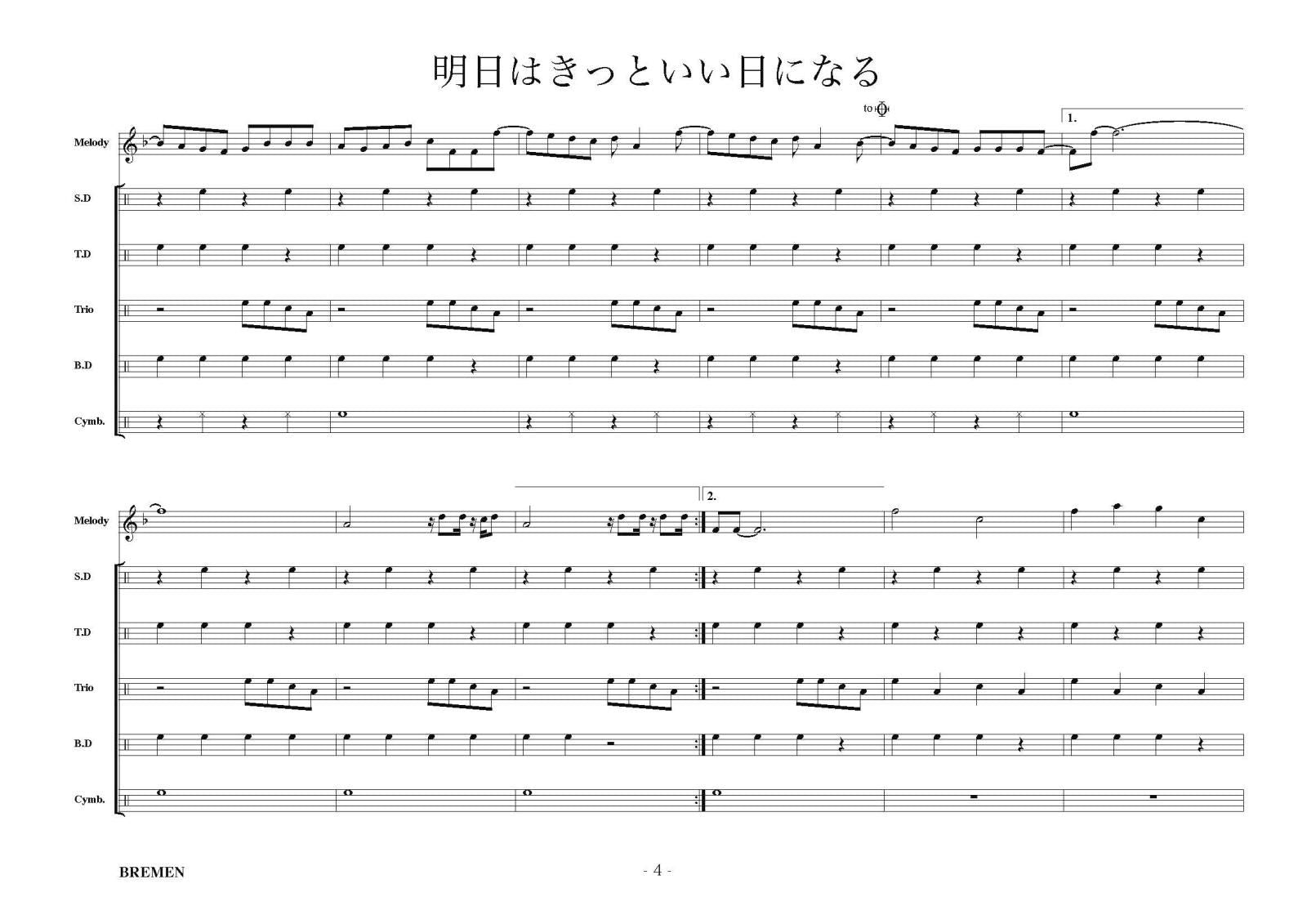 主な使用楽器:スネアドラム(小太鼓)、テナードラム(中太鼓)、トリオタム(ツインタム)、バスドラム(大太鼓)、シンバル等