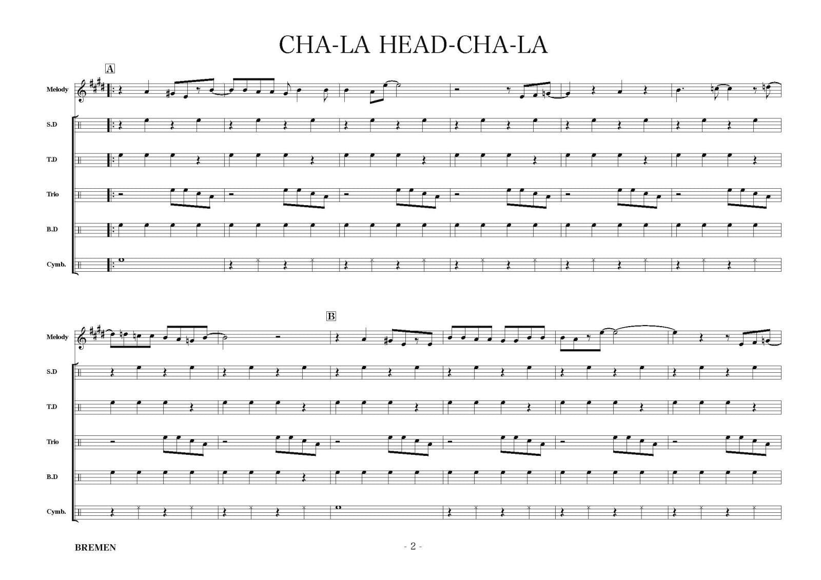 主な使用楽器:スネアドラム(小太鼓)、テナードラム(中太鼓)、トリオタム(ツインタム)、バスドラム(大太鼓)、シンバル等