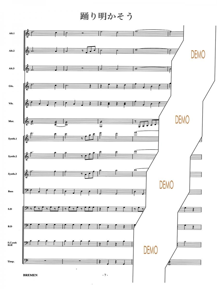 主な使用楽器:鍵盤ハーモニカ、グロッケン(鉄琴)、ビブラフォーン(鉄琴)、マリンバ(木琴)、シンセサイザー(電子オルガン)、ベース(低音楽器)、スネアドラム(小太鼓)、バスドラム(大太鼓)、パーカッション、ティンパニー等