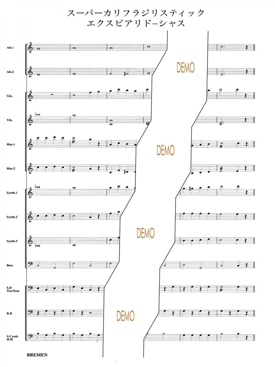 主な使用楽器:鍵盤ハーモニカ、グロッケン(鉄琴)、ビブラフォーン(鉄琴)、マリンバ(木琴)、シンセサイザー(電子オルガン)、ベース(低音楽器)、スネアドラム(小太鼓)、バスドラム(大太鼓)、パーカッション、ティンパニー等