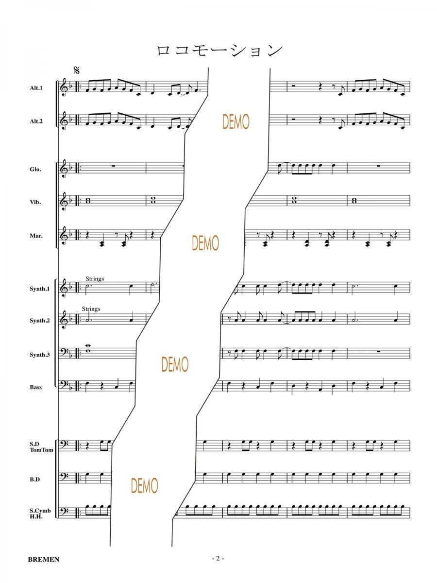 主な使用楽器:鍵盤ハーモニカ、グロッケン(鉄琴)、ビブラフォーン(鉄琴)、マリンバ(木琴)、シンセサイザー(電子オルガン)、ベース(低音楽器)、スネアドラム(小太鼓)、バスドラム(大太鼓)、パーカッション、ティンパニー等