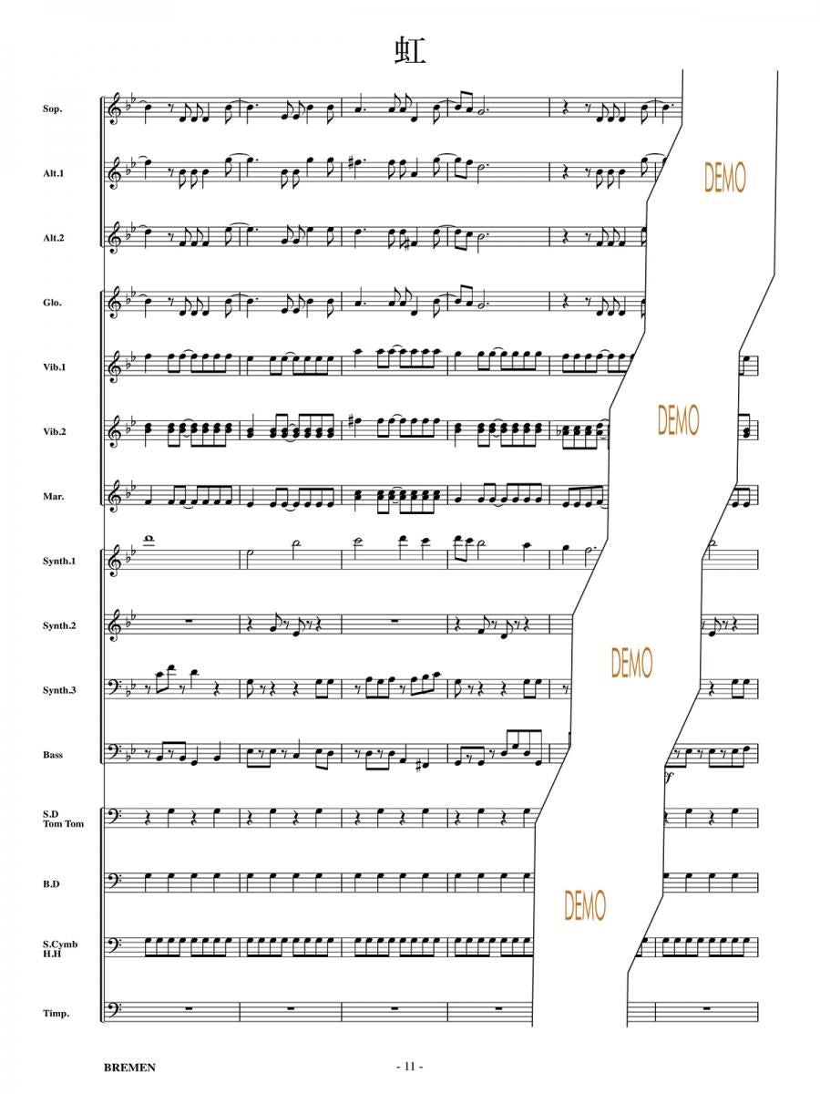 主な使用楽器:鍵盤ハーモニカ、グロッケン(鉄琴)、ビブラフォーン(鉄琴)、マリンバ(木琴)、シンセサイザー(電子オルガン)、ベース(低音楽器)、スネアドラム(小太鼓)、バスドラム(大太鼓)、パーカッション、ティンパニー等