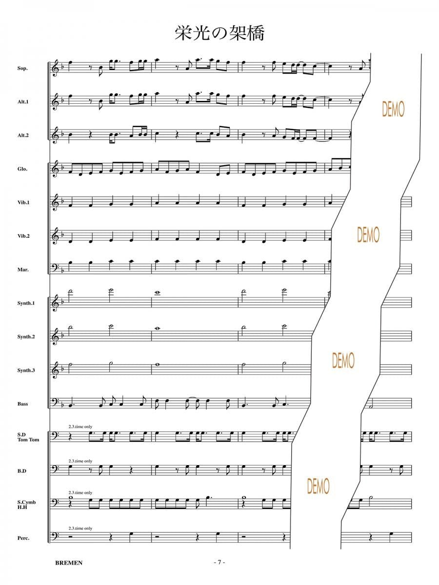 主な使用楽器:鍵盤ハーモニカ、グロッケン(鉄琴)、ビブラフォーン(鉄琴)、マリンバ(木琴)、シンセサイザー(電子オルガン)、ベース(低音楽器)、スネアドラム(小太鼓)、バスドラム(大太鼓)、パーカッション、ティンパニー等