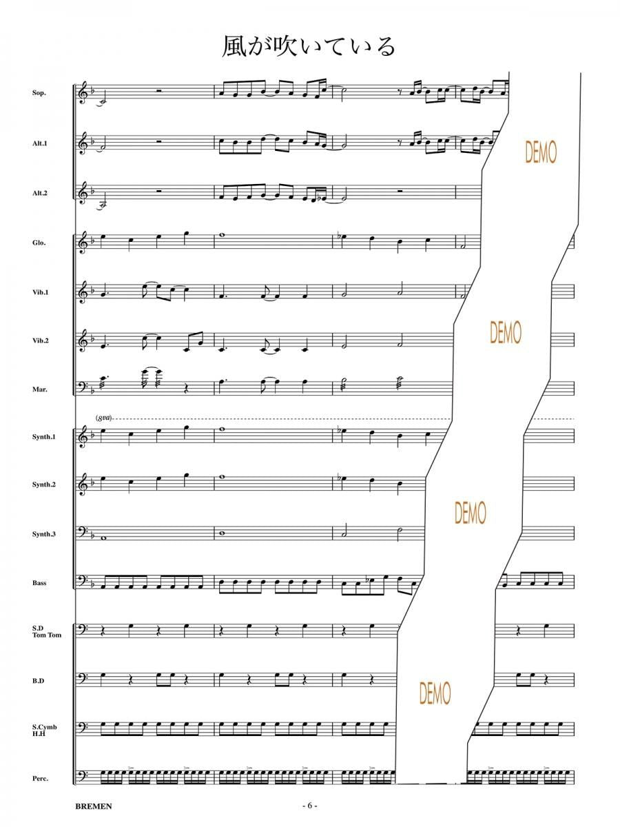 主な使用楽器:鍵盤ハーモニカ、グロッケン(鉄琴)、ビブラフォーン(鉄琴)、マリンバ(木琴)、シンセサイザー(電子オルガン)、ベース(低音楽器)、スネアドラム(小太鼓)、バスドラム(大太鼓)、パーカッション、ティンパニー等