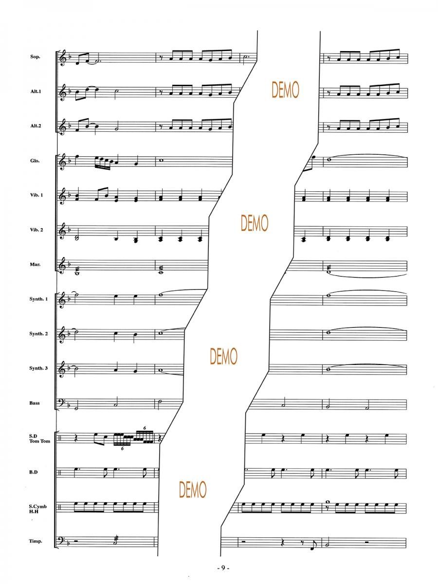 主な使用楽器:鍵盤ハーモニカ、グロッケン(鉄琴)、ビブラフォーン(鉄琴)、マリンバ(木琴)、シンセサイザー(電子オルガン)、ベース(低音楽器)、スネアドラム(小太鼓)、バスドラム(大太鼓)、パーカッション、ティンパニー等