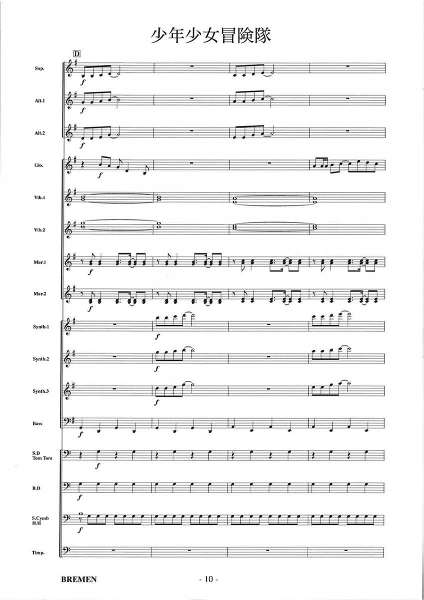 主な使用楽器:鍵盤ハーモニカ、グロッケン(鉄琴)、ビブラフォーン(鉄琴)、マリンバ(木琴)、シンセサイザー(電子オルガン)、ベース(低音楽器)、スネアドラム(小太鼓)、バスドラム(大太鼓)、パーカッション、ティンパニー等