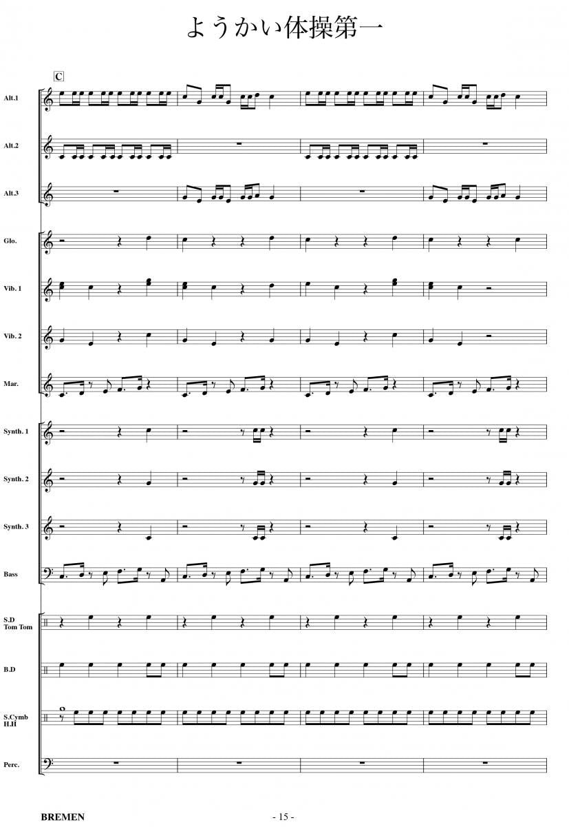 主な使用楽器:鍵盤ハーモニカ、グロッケン(鉄琴)、ビブラフォーン(鉄琴)、マリンバ(木琴)、シンセサイザー(電子オルガン)、ベース(低音楽器)、スネアドラム(小太鼓)、バスドラム(大太鼓)、パーカッション、ティンパニー等