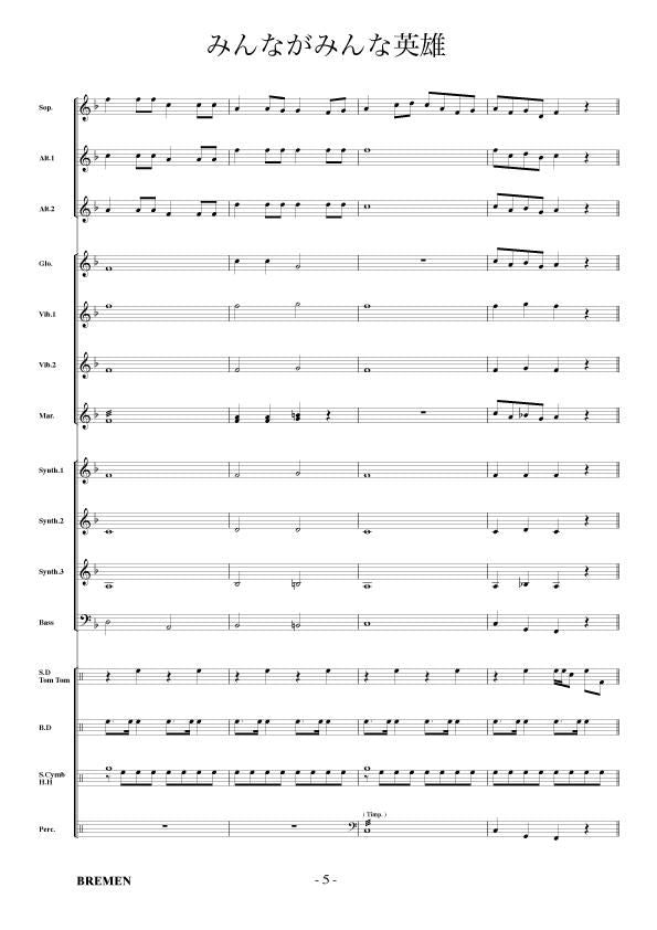 主な使用楽器:鍵盤ハーモニカ、グロッケン(鉄琴)、ビブラフォーン(鉄琴)、マリンバ(木琴)、シンセサイザー(電子オルガン)、ベース(低音楽器)、スネアドラム(小太鼓)、バスドラム(大太鼓)、パーカッション、ティンパニー等