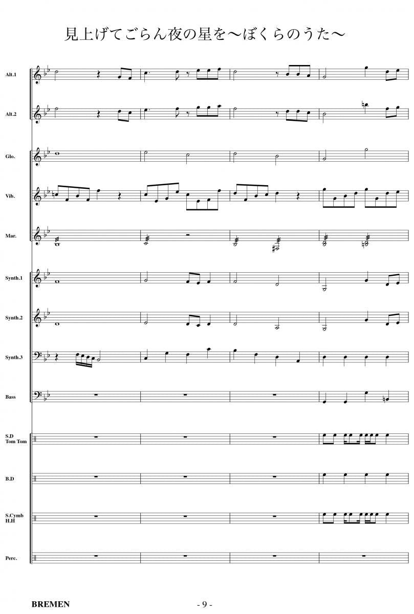 主な使用楽器:鍵盤ハーモニカ、グロッケン(鉄琴)、ビブラフォーン(鉄琴)、マリンバ(木琴)、シンセサイザー(電子オルガン)、ベース(低音楽器)、スネアドラム(小太鼓)、バスドラム(大太鼓)、パーカッション、ティンパニー等