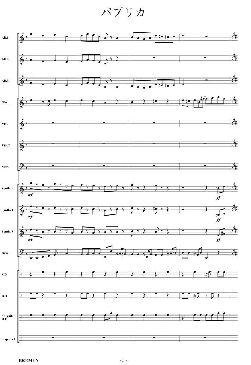 主な使用楽器:鍵盤ハーモニカ、グロッケン(鉄琴)、ビブラフォーン(鉄琴)、マリンバ(木琴)、シンセサイザー(電子オルガン)、ベース(低音楽器)、スネアドラム(小太鼓)、バスドラム(大太鼓)、パーカッション、ティンパニー等