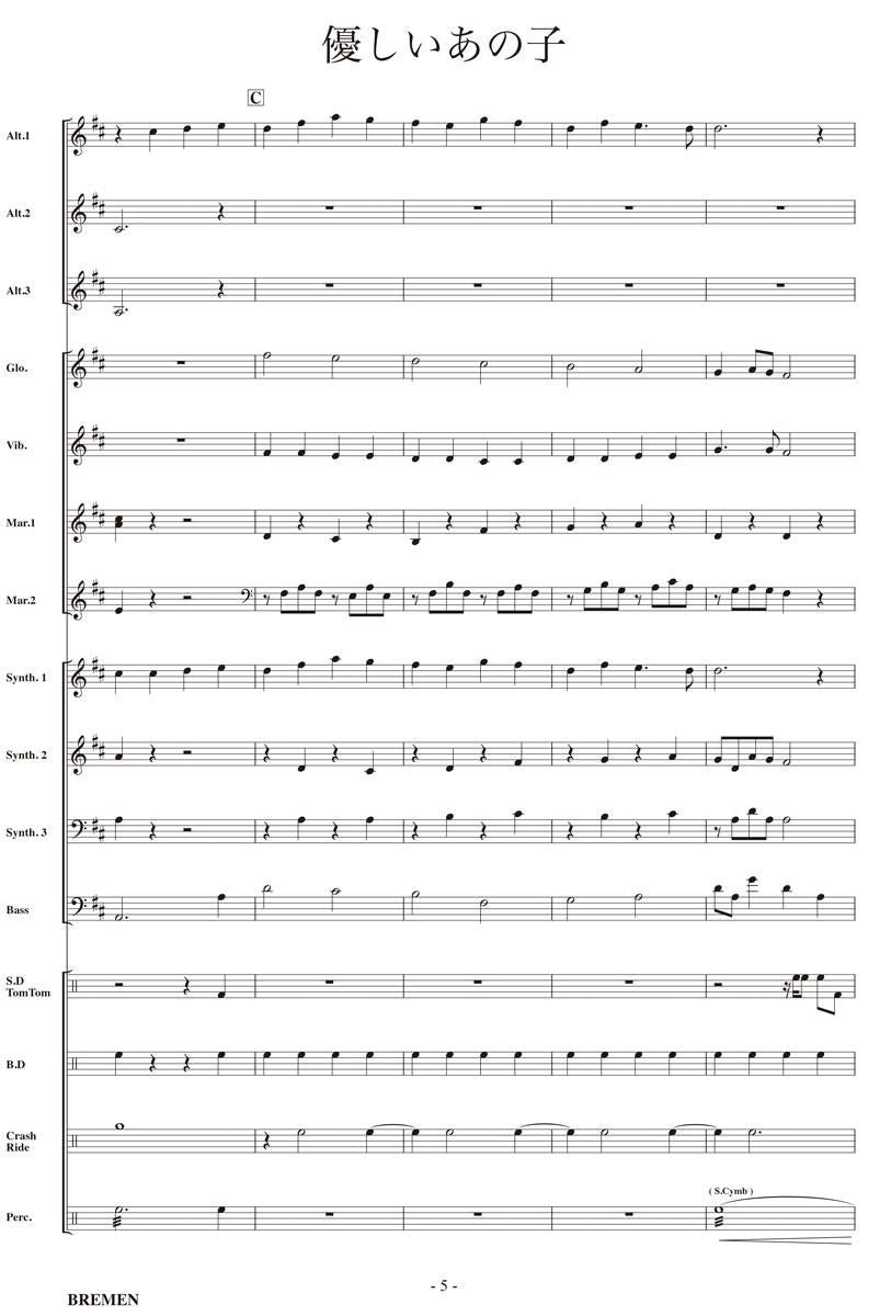 主な使用楽器:鍵盤ハーモニカ、グロッケン(鉄琴)、ビブラフォーン(鉄琴)、マリンバ(木琴)、シンセサイザー(電子オルガン)、ベース(低音楽器)、スネアドラム(小太鼓)、バスドラム(大太鼓)、パーカッション、ティンパニー等