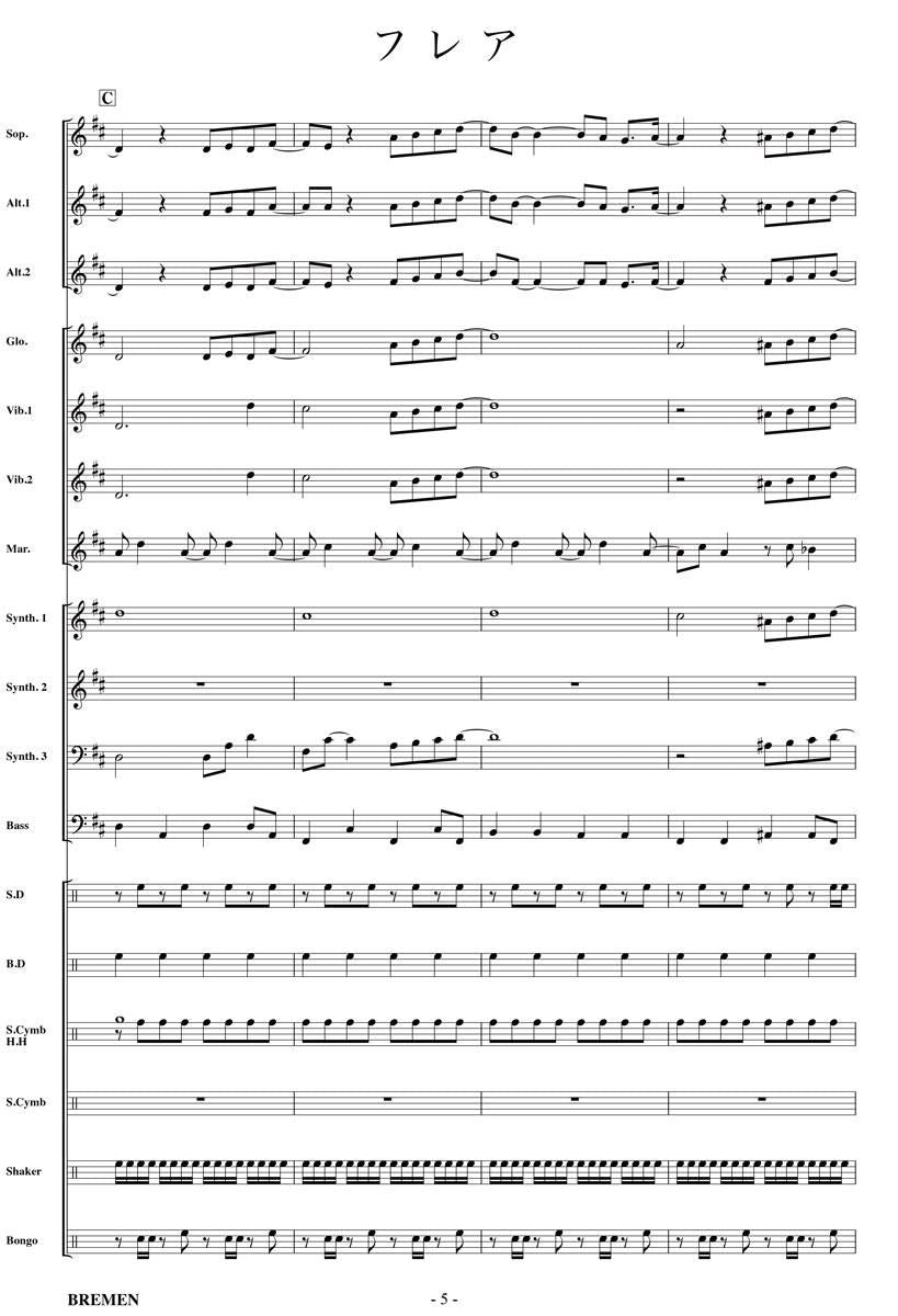 主な使用楽器:鍵盤ハーモニカ、グロッケン(鉄琴)、ビブラフォーン(鉄琴)、マリンバ(木琴)、シンセサイザー(電子オルガン)、ベース(低音楽器)、スネアドラム(小太鼓)、バスドラム(大太鼓)、パーカッション、ティンパニー等