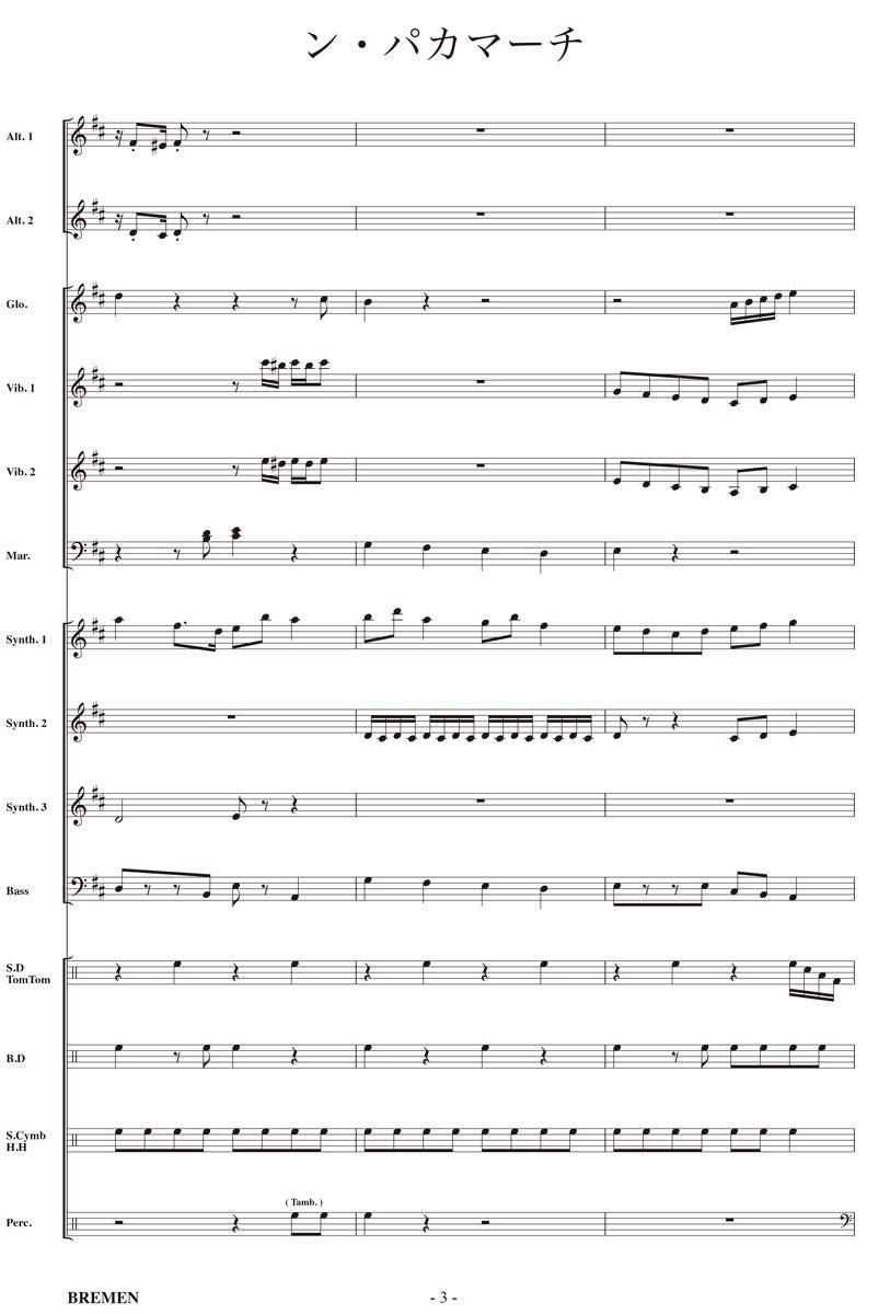 主な使用楽器:鍵盤ハーモニカ、グロッケン(鉄琴)、ビブラフォーン(鉄琴)、マリンバ(木琴)、シンセサイザー(電子オルガン)、ベース(低音楽器)、スネアドラム(小太鼓)、バスドラム(大太鼓)、パーカッション、ティンパニー等