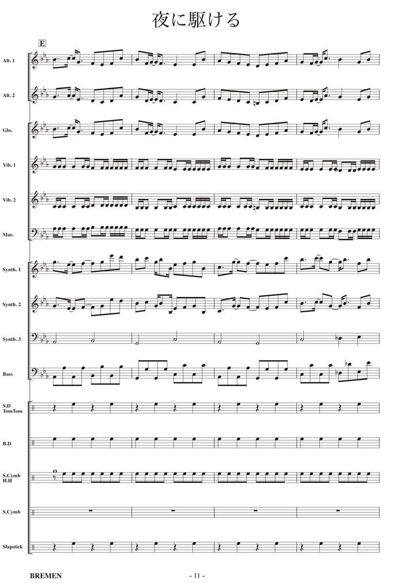 主な使用楽器:鍵盤ハーモニカ、グロッケン(鉄琴)、ビブラフォーン(鉄琴)、マリンバ(木琴)、シンセサイザー(電子オルガン)、ベース(低音楽器)、スネアドラム(小太鼓)、バスドラム(大太鼓)、パーカッション、ティンパニー等