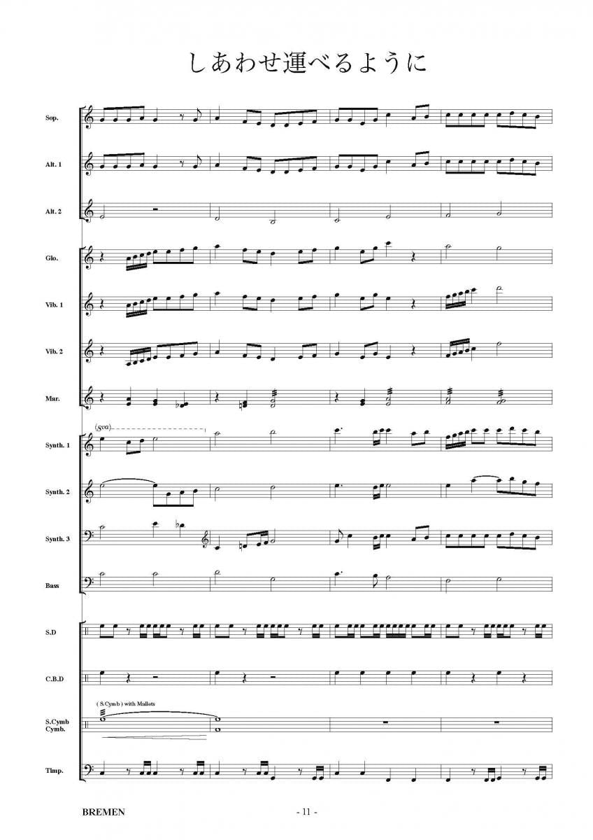 主な使用楽器:鍵盤ハーモニカ、グロッケン(鉄琴)、ビブラフォーン(鉄琴)、マリンバ(木琴)、シンセサイザー(電子オルガン)、ベース(低音楽器)、スネアドラム(小太鼓)、バスドラム(大太鼓)、パーカッション、ティンパニー等