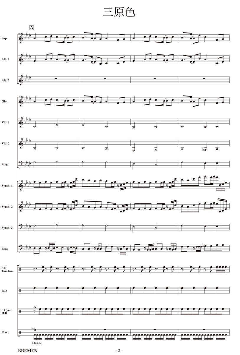 主な使用楽器:鍵盤ハーモニカ、グロッケン(鉄琴)、ビブラフォーン(鉄琴)、マリンバ(木琴)、シンセサイザー(電子オルガン)、ベース(低音楽器)、スネアドラム(小太鼓)、バスドラム(大太鼓)、パーカッション、ティンパニー等