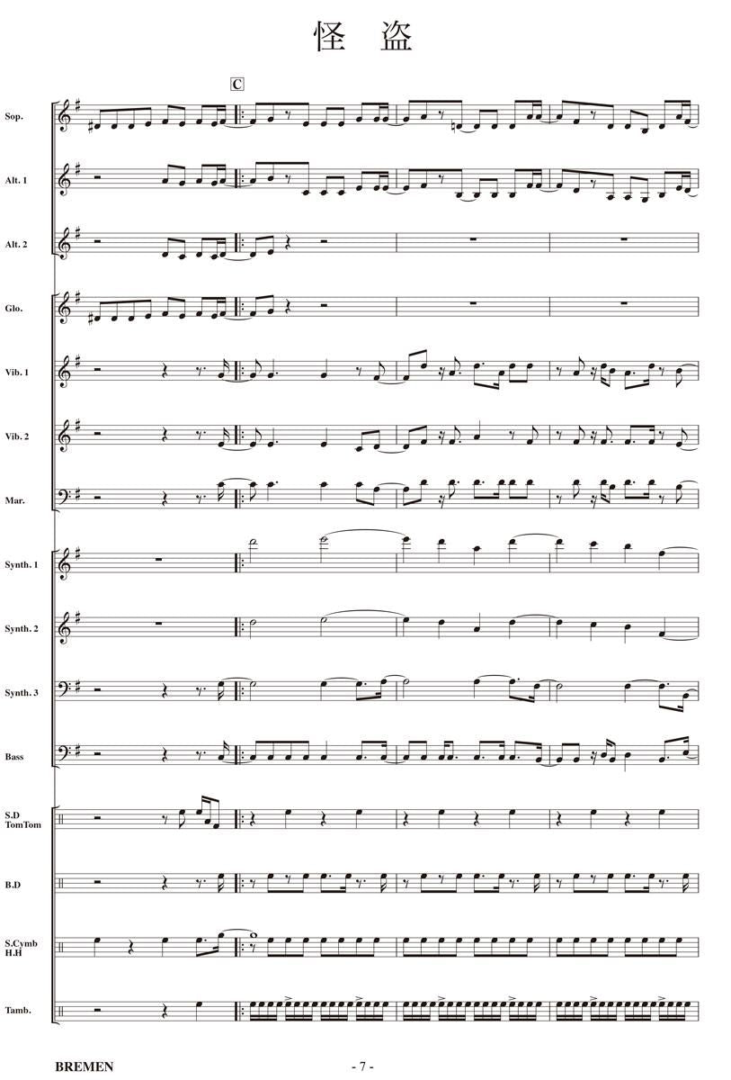 主な使用楽器:鍵盤ハーモニカ、グロッケン(鉄琴)、ビブラフォーン(鉄琴)、マリンバ(木琴)、シンセサイザー(電子オルガン)、ベース(低音楽器)、スネアドラム(小太鼓)、バスドラム(大太鼓)、パーカッション、ティンパニー等
