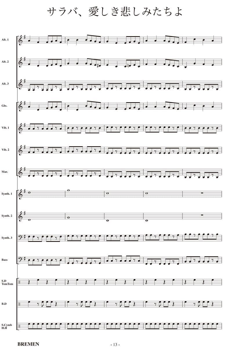 主な使用楽器:鍵盤ハーモニカ、グロッケン(鉄琴)、ビブラフォーン(鉄琴)、マリンバ(木琴)、シンセサイザー(電子オルガン)、ベース(低音楽器)、スネアドラム(小太鼓)、バスドラム(大太鼓)、パーカッション、ティンパニー等