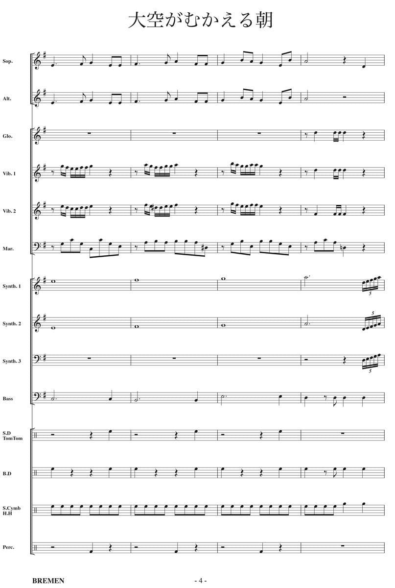 主な使用楽器:鍵盤ハーモニカ、グロッケン(鉄琴)、ビブラフォーン(鉄琴)、マリンバ(木琴)、シンセサイザー(電子オルガン)、ベース(低音楽器)、スネアドラム(小太鼓)、バスドラム(大太鼓)、パーカッション、ティンパニー等