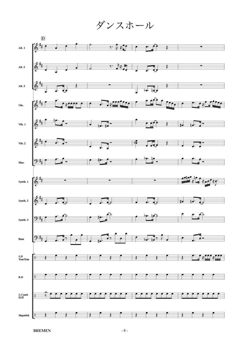 主な使用楽器:鍵盤ハーモニカ、グロッケン(鉄琴)、ビブラフォーン(鉄琴)、マリンバ(木琴)、シンセサイザー(電子オルガン)、ベース(低音楽器)、スネアドラム(小太鼓)、バスドラム(大太鼓)、パーカッション、ティンパニー等