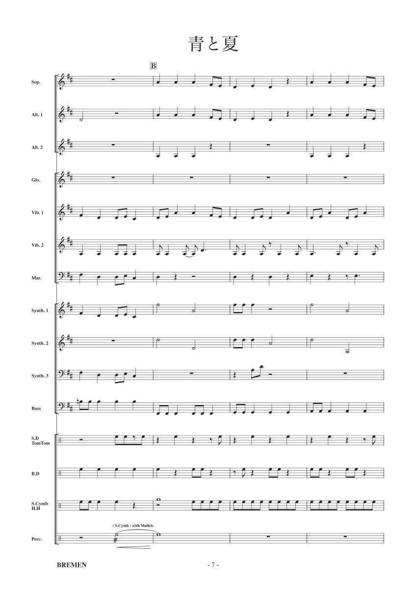 主な使用楽器:鍵盤ハーモニカ、グロッケン(鉄琴)、ビブラフォーン(鉄琴)、マリンバ(木琴)、シンセサイザー(電子オルガン)、ベース(低音楽器)、スネアドラム(小太鼓)、バスドラム(大太鼓)、パーカッション、ティンパニー等
