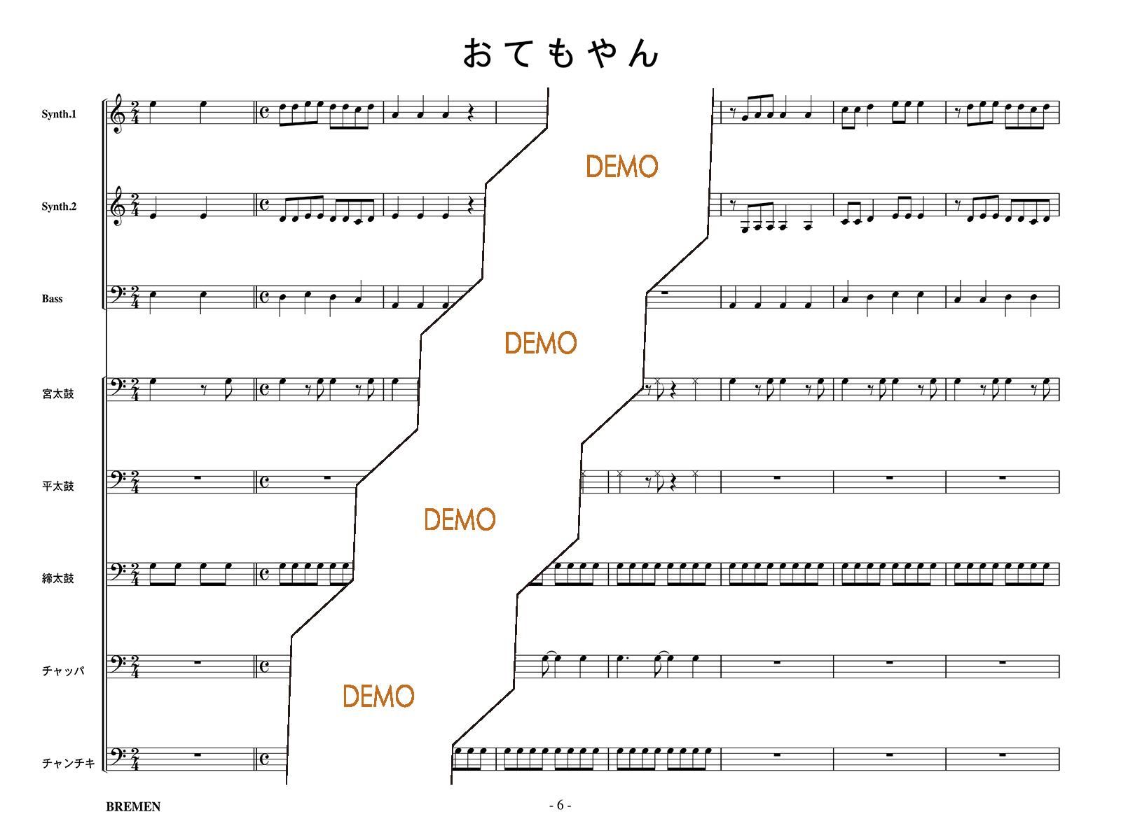 主な使用楽器:鍵盤ハーモニカ、グロッケン(鉄琴)、ビブラフォーン(鉄琴)、マリンバ(木琴)、シンセサイザー(電子オルガン)、ベース(低音楽器)、宮太鼓、長胴太鼓、平太鼓(たる太鼓)、締太鼓、チャンチキ、チャッパ等