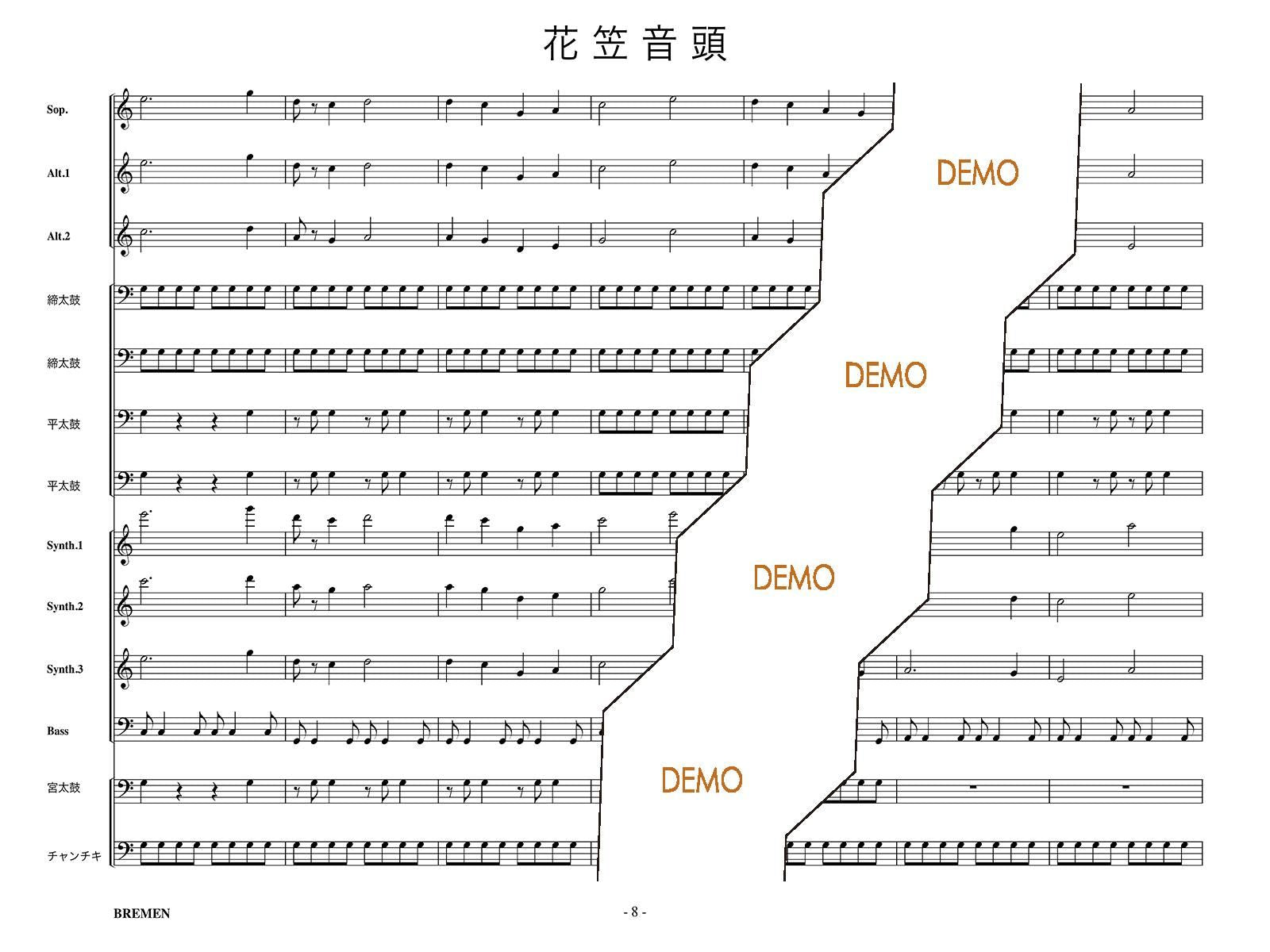 主な使用楽器:鍵盤ハーモニカ、グロッケン(鉄琴)、ビブラフォーン(鉄琴)、マリンバ(木琴)、シンセサイザー(電子オルガン)、ベース(低音楽器)、宮太鼓、長胴太鼓、平太鼓(たる太鼓)、締太鼓、チャンチキ、チャッパ等