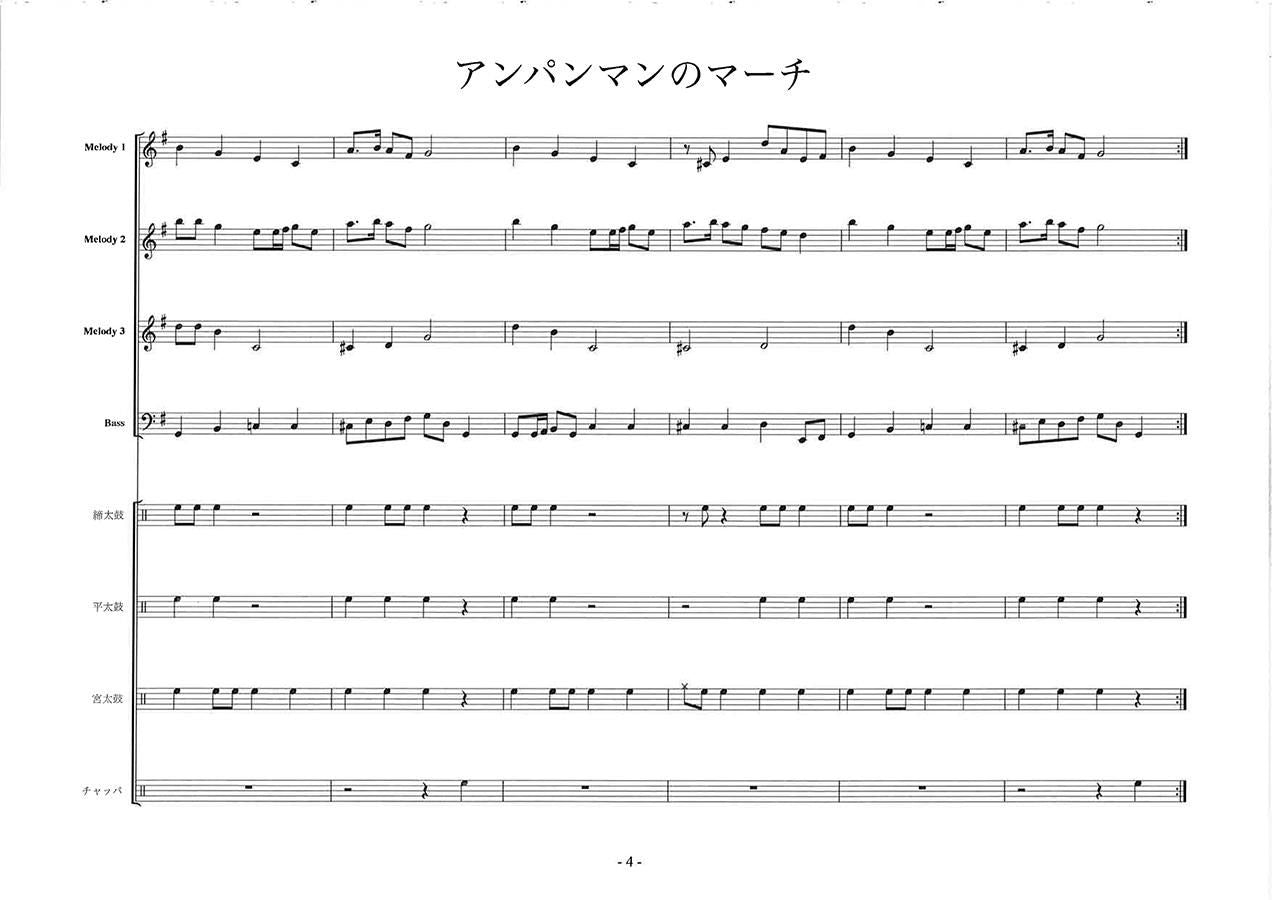 主な使用楽器:鍵盤ハーモニカ、グロッケン(鉄琴)、ビブラフォーン(鉄琴)、マリンバ(木琴)、シンセサイザー(電子オルガン)、ベース(低音楽器)、宮太鼓、長胴太鼓、平太鼓(たる太鼓)、締太鼓、チャンチキ、チャッパ等